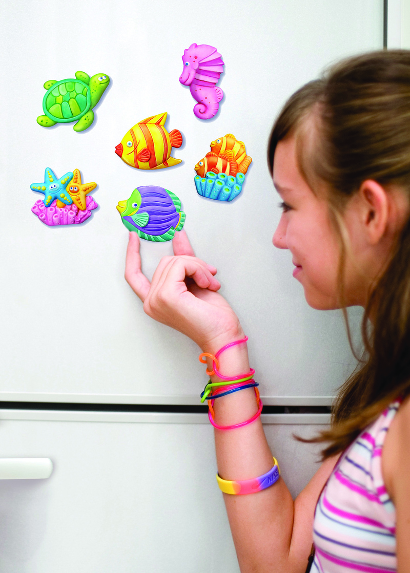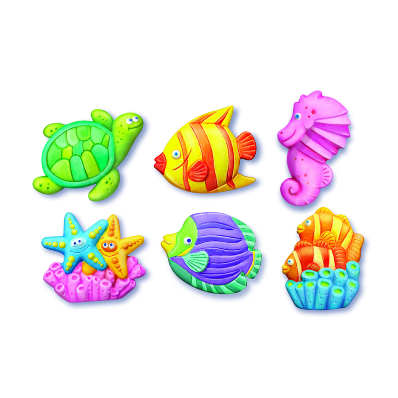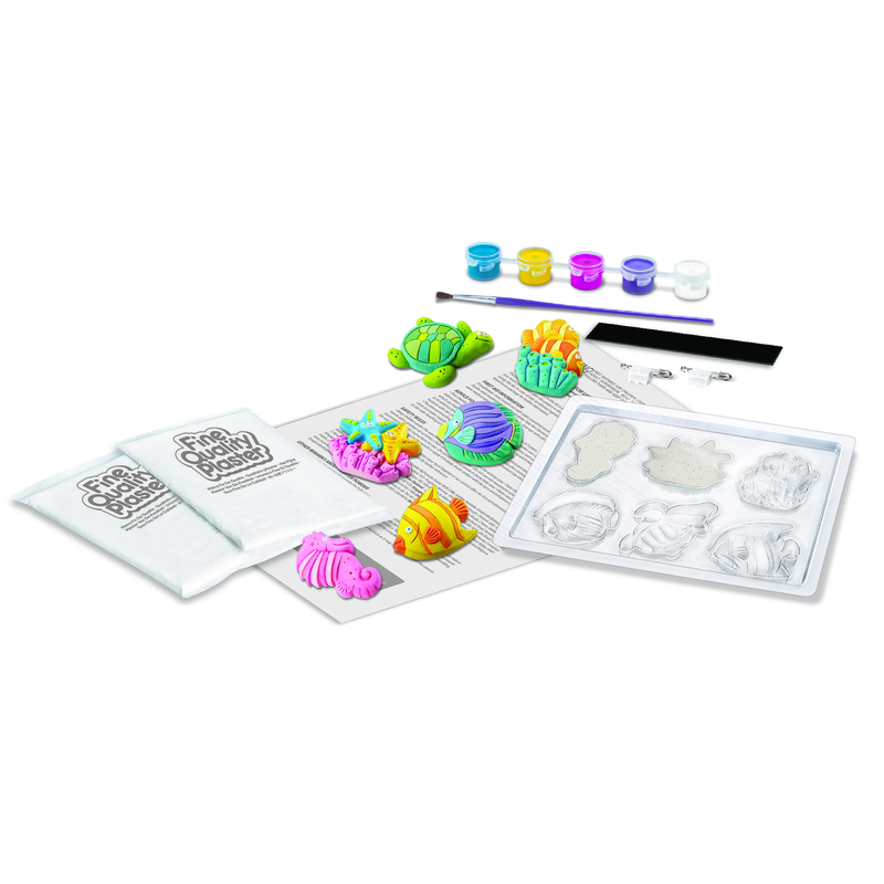 Κατασκεύασε μαγνητάκια και καρφίτσες με θαλασσινά ζωάκια. Χρωμάτισέ τα με δικά σου σχέδια ή σύμφωνα με τις οδηγίες και διακόσμησε το ψυγείο και το δωμάτιό σου. Μπορούν να φορεθούν και σαν καρφίτσες γισ τα ρούχα ή την τσάντα σου. ΠΑΡΑΣΚΕΥΗ: Προετοίμασε το μείγμα του γύψου, ακολουθώντας πιστά τις οδηγίες όπως αναγράφονται στη συσκευασία. Ρίξε το μείγμα του γύψου στα καλούπια και ανακίνηδε τα ελαφρά. Άφησε τον γύψο να στερεοποιηθεί για λίγη ώρα και ζωγράφισε τις θαλάσσιες φιγούρες με τα χρώματα που περιλαμβάνονται. ΠΕΡΙΕΧΟΜΕΝΑ: 1 καλούπι με 6 σχέδια, 1 σακουλάκι γύψο σε σκόνη, 1 ταινία με μαγνήτες, 1 παλέτα με 5 διαφορετικά χρώματα, 1 πινελάκι. Περιέχονται οδηγίες στα Ελληνικά. 12/ΥΠ. – 36/ΚΙΒ.